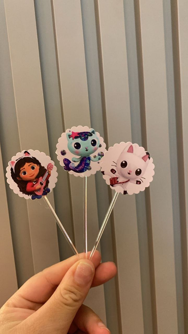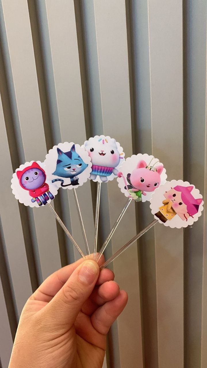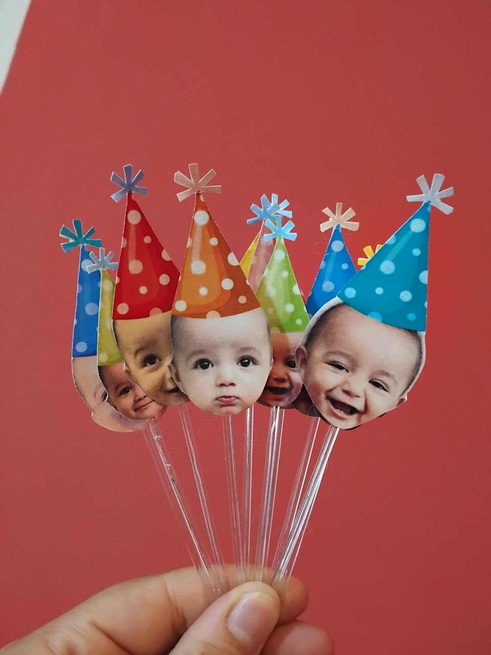 Feitas em papel fotográfico ou cartão, com cerca de 4x4cm, são 100% personalizadas no tema da sua festa e já vão prontinhas com o palito — é só espetar e arrasar na decoração!